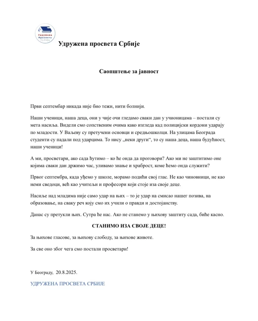 "Prvi septembar nikada nije bio teži, niti bolniji. Naši učenici, naša deca, oni u čije oči gledamo svaki dan u učionicama – postali su meta nasilja. Videli smo sopstvenim očima kako izgleda kad policijski kordoni udaraju po mladosti. U Valjevu su pretučeni osnovci i srednjoškolci. Na ulicama Beograda studenti su padali pod udarcima. To nisu „neki drugi“, to su naša deca, naša budućnost, naši učenici!