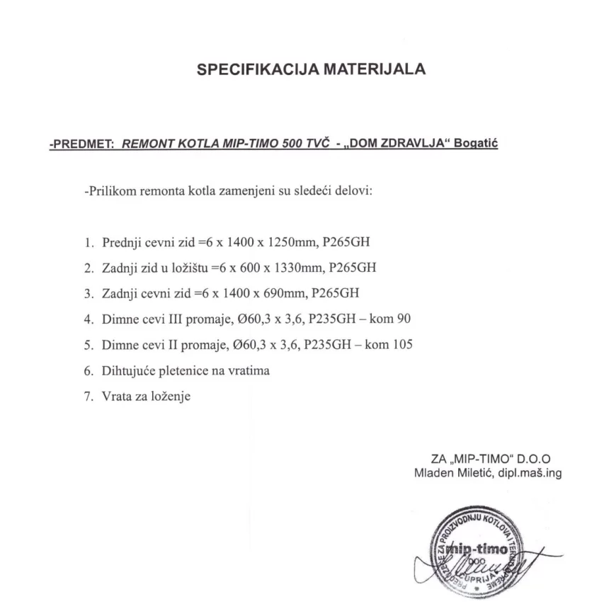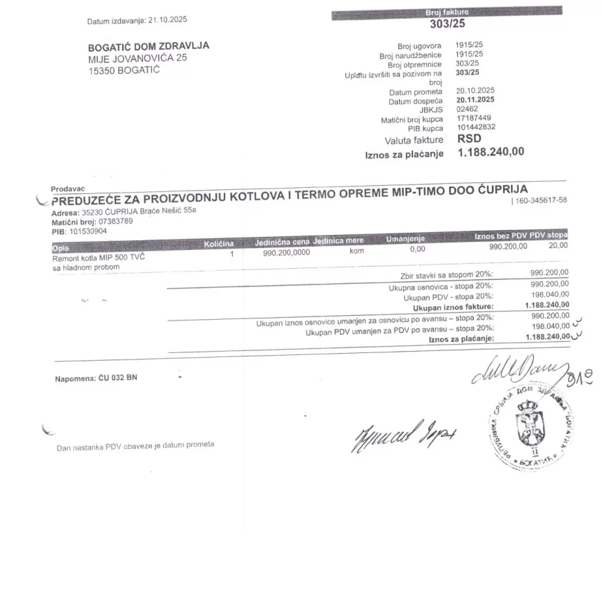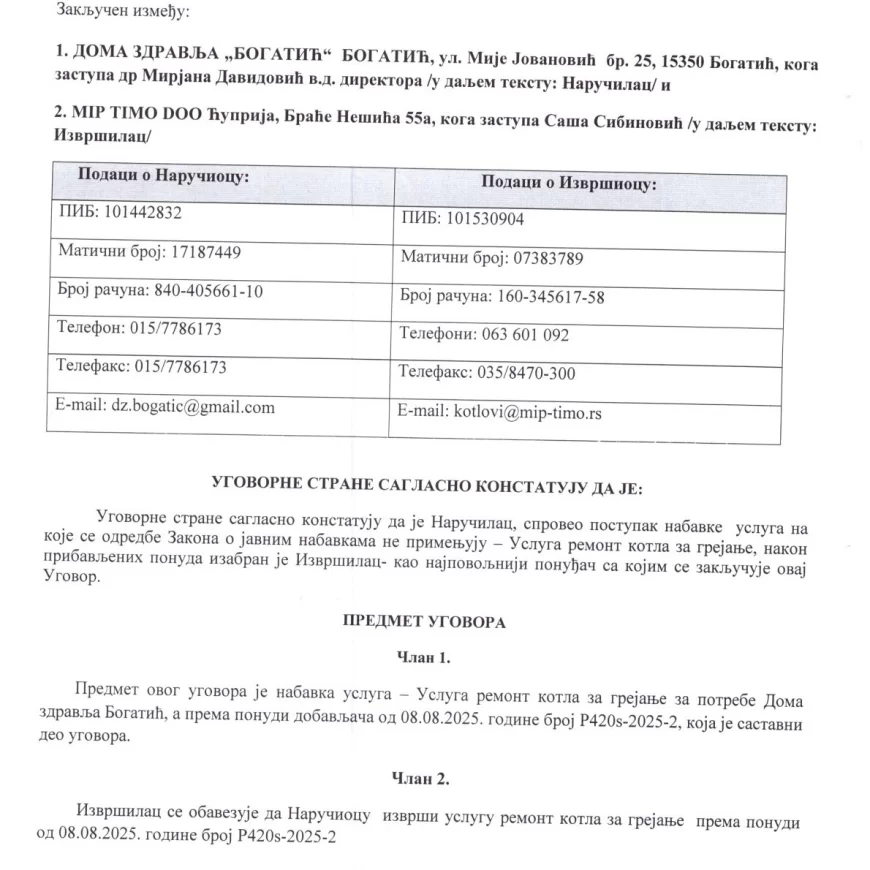 "Dom zdravlja Bogatić je sa firmom "MIP-TIMO" iz Ćuprije, sklopio ugovor o remontu kotla za grejanje.