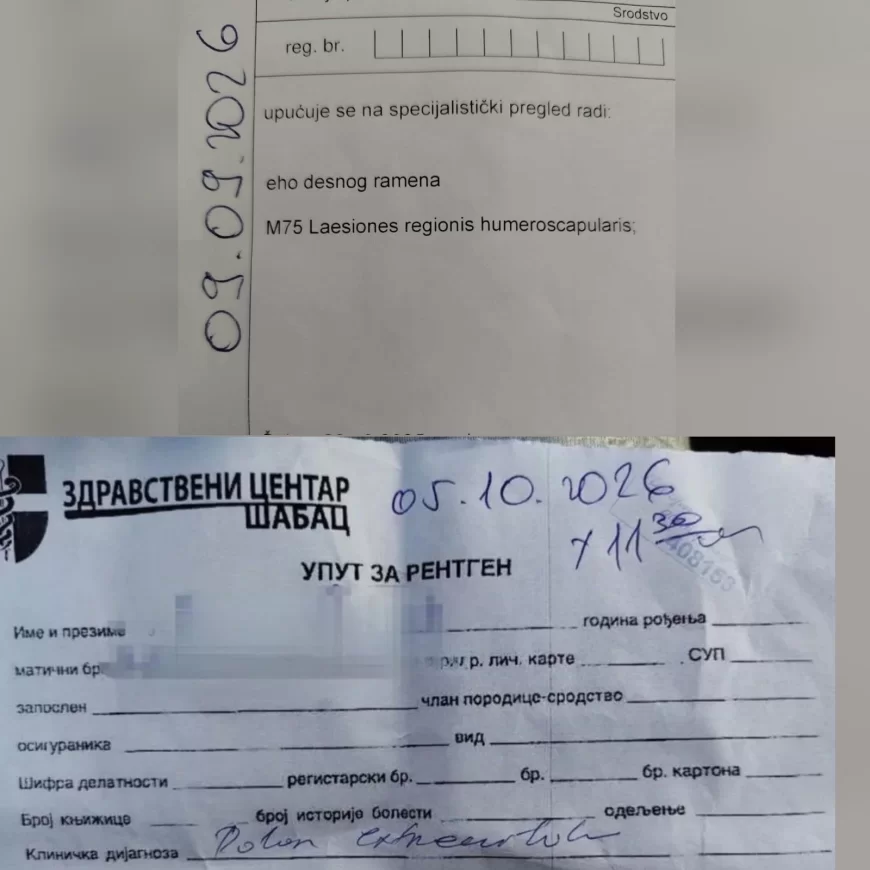 Poslednjih dana u našu redakciju pristiže sve veći broj pritužbi građana, praćenih fotografijama uputa i potvrda zakazivanja, na kojima se vidi da se ultrazvučni pregledi u Šapcu zakazuju tek za septembar i oktobar 2026. godine. Reč je o dijagnostičkim pregledima koji su ključni za pokretanje terapije, posebno kod pacijenata sa povredama, bolovima u ramenu ili sumnjama na oštećenja mišića i tetiva.