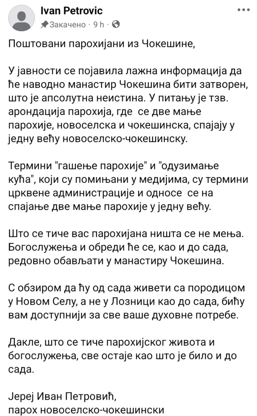 Što se tiče vas parohijana ništa se ne menja. Bogosluženja i obredi će se, kao i do sada, redovno obavljati u manastiru Čokešina.