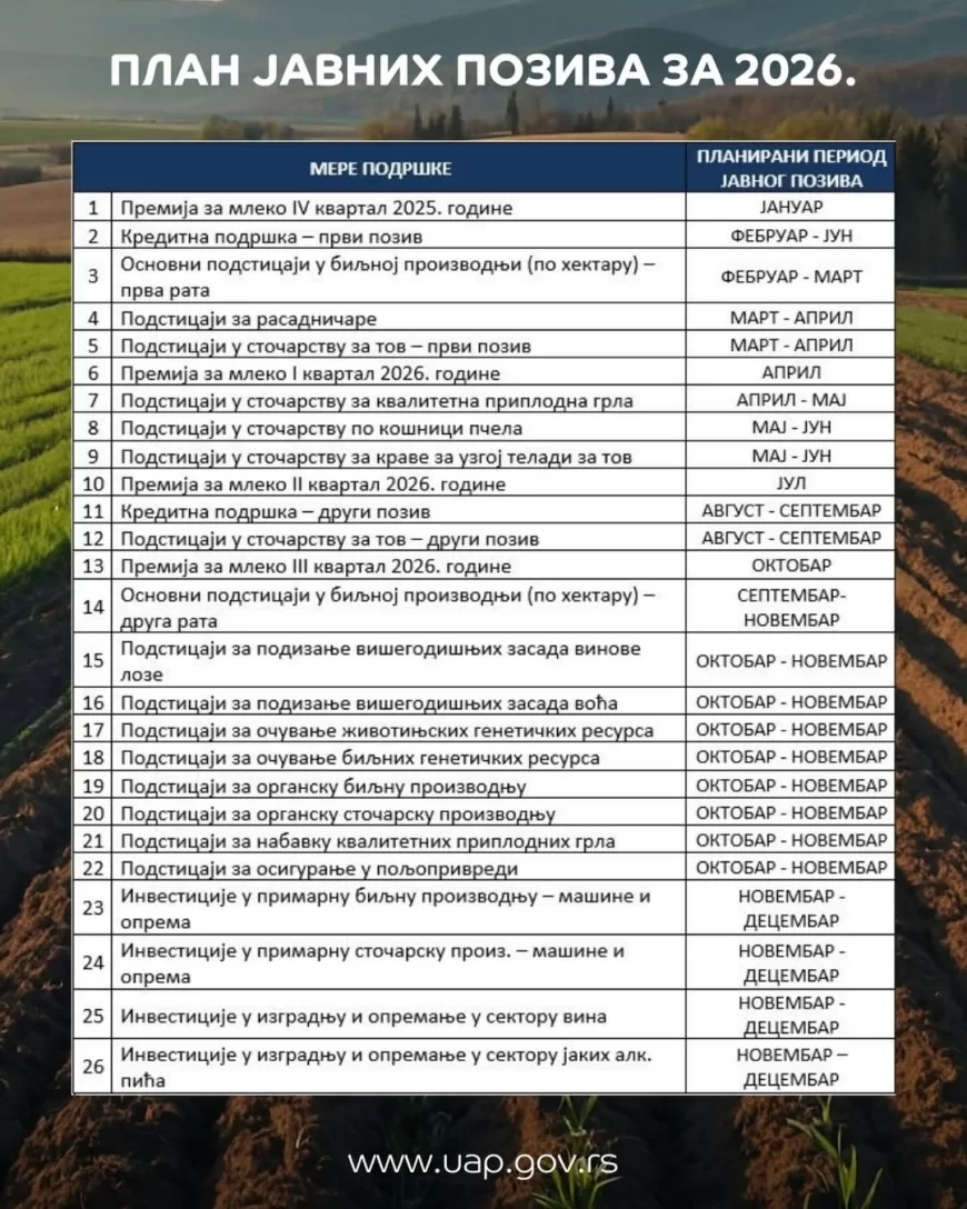 Ministarstvo poljoprivrede, šumarstva i vodoprivrede objavilo je kalendar podsticaja planiranih za 2026. godinu.