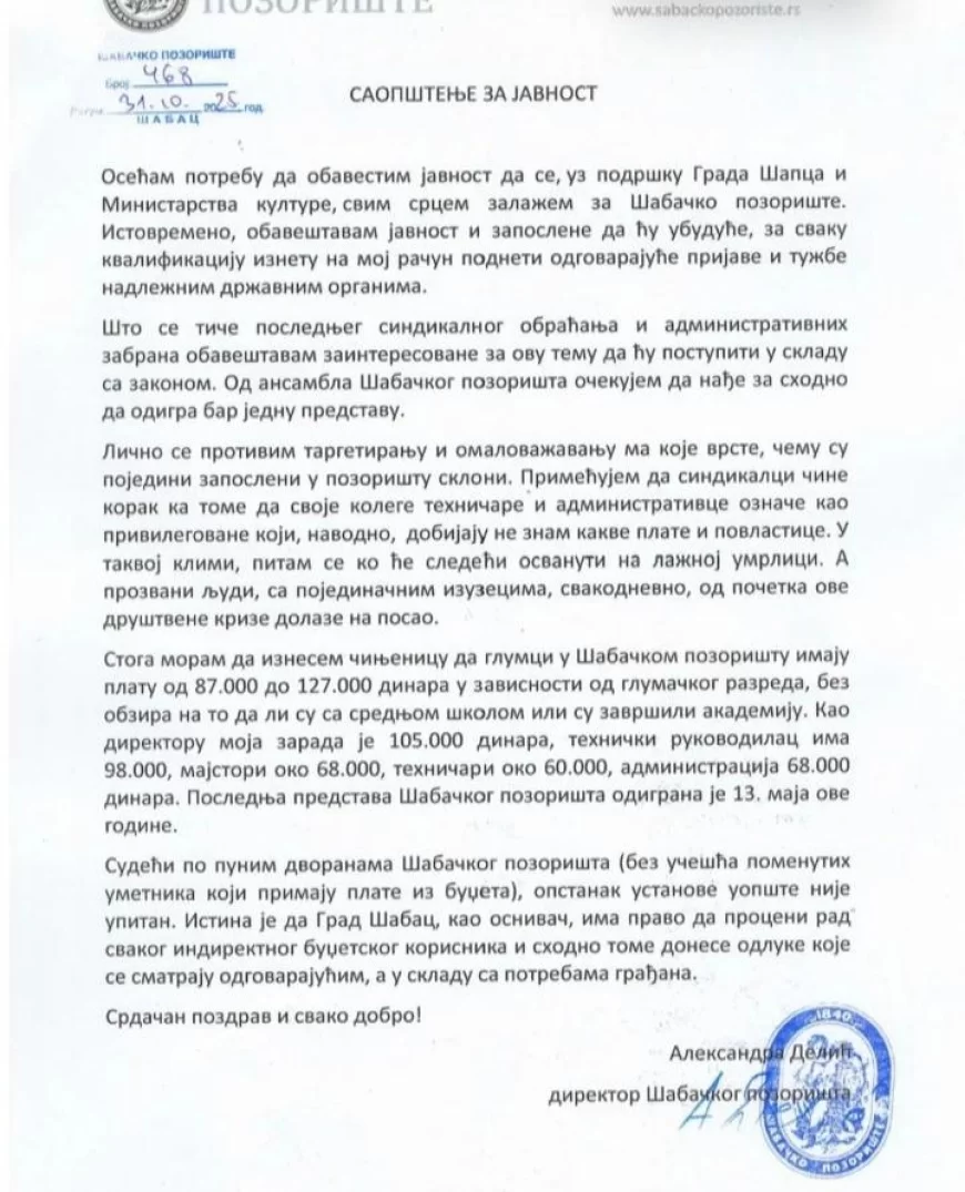 Nakon što je 31. oktobra 2025. godine direktorka Šabačkog pozorišta Aleksandra Delić uputila javno saopštenje, većinski deo kolektiva te ustanove, uključujući celokupan glumački ansambl, oglasio se otvorenim pismom u kojem postavlja niz pitanja i reaguje na navode iz njenog obraćanja. U nastavku prenosimo upotpunosti otvoreno pismo zaposlenih, kao i kompletno saopštenje direktorke Delić.