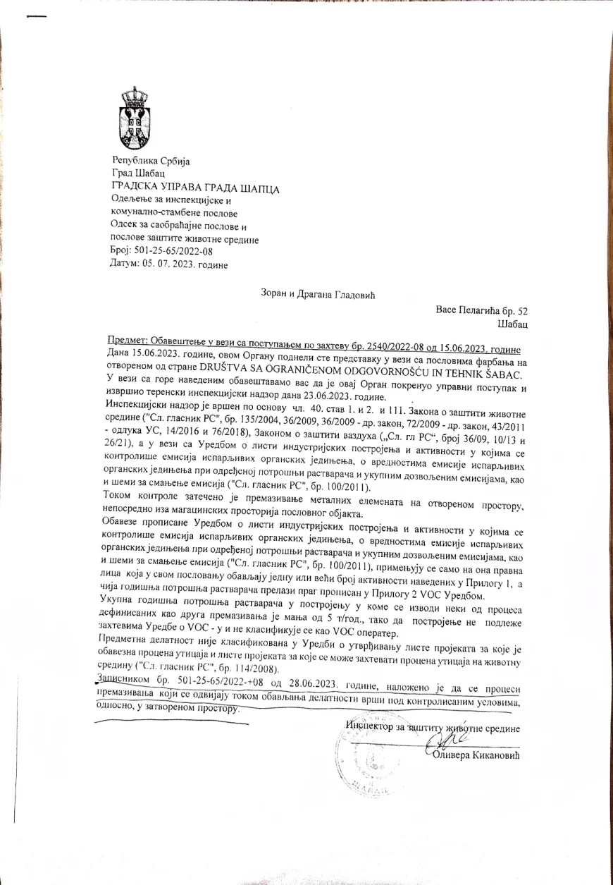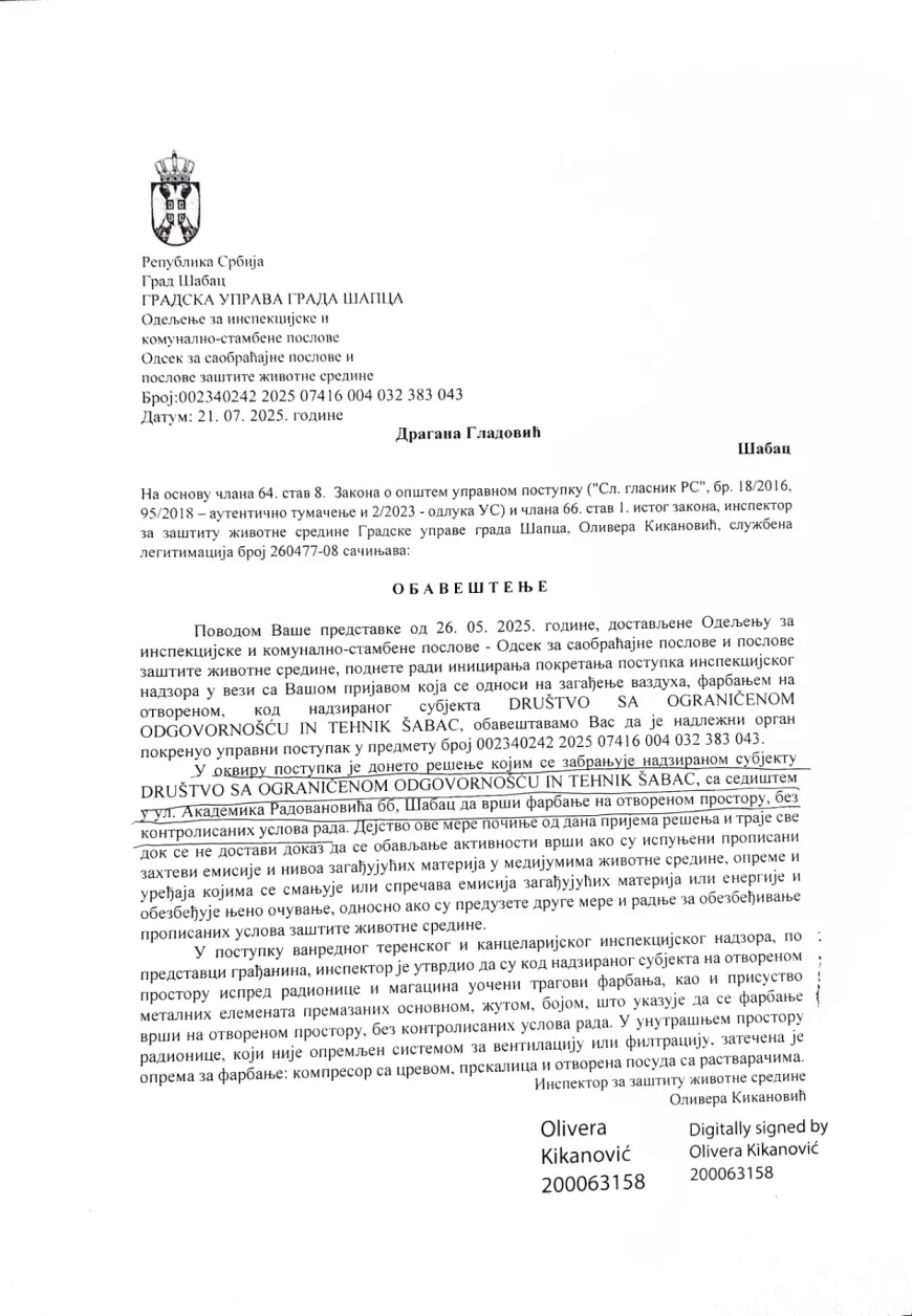 U dokumentu iz jula 2025. godine navodi se i da je doneto rešenje kojim se nadziranom subjektu zabranjuje vršenje farbanja na otvorenom prostoru na navedenoj adresi, sve dok se ne dostavi dokaz da su ispunjeni propisani uslovi rada i zaštite životne sredine.