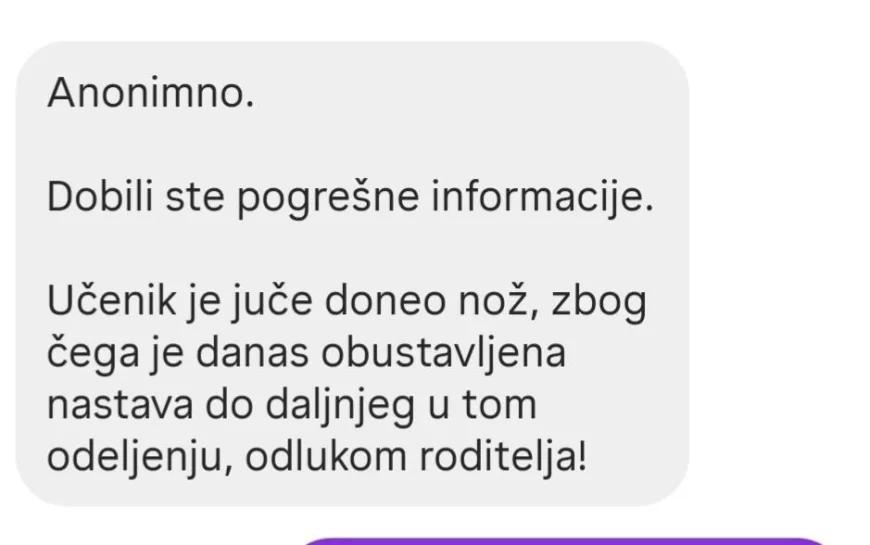 „Učenik je juče doneo nož, zbog čega je danas obustavljena nastava do daljnjeg u tom odeljenju, odlukom roditelja“, navela je jedna majka.